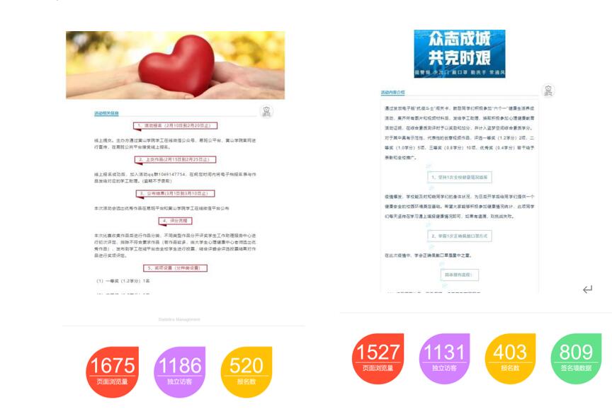 2月4日开展“易班轻应用——防疫新型冠状病毒”活动,从学校有关通知、辟谣科普、抗击疫情、众志成城、宅就是贡献、知识问答、为武汉加油等7个方面进行宣传,其中页面浏览量15002人次、独立访客6413人次、评论数据162人次。