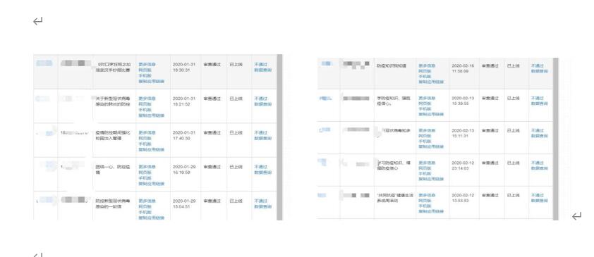 疫情防控期间,校易班工作站依托易班线上平台积极开展疫情防控知识宣传普及工作,在易班平台共发文71篇,其中与疫情相关文章共有43篇,易班轻应用31个,校级优课课群成员4549人。