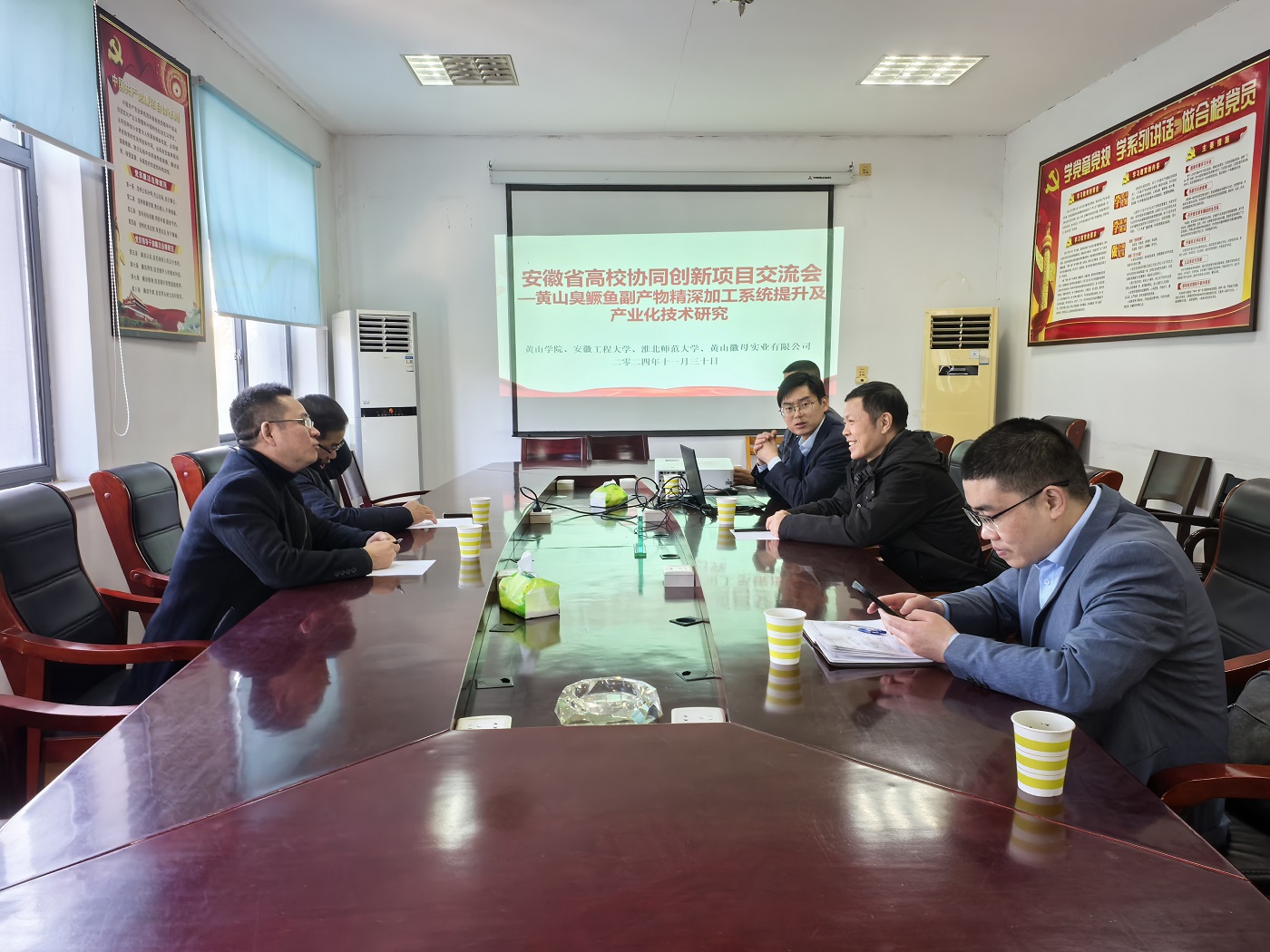 11月30日下午,健康食品与功能生物制品创新团队召开安徽省高校协同创新项目—黄山臭鳜鱼副产物精深加工系统提升及产业化技术研究(GXXT-2023-053)交流会,淮北师范大学生命科学学院院长李峰、安徽工程大学生物与食品工程学院院长葛飞、MK体育网页版登录入口.MK(中国)国资处处长佘新松及团队负责人吴永祥等参加了会议,会议由佘新松主持。