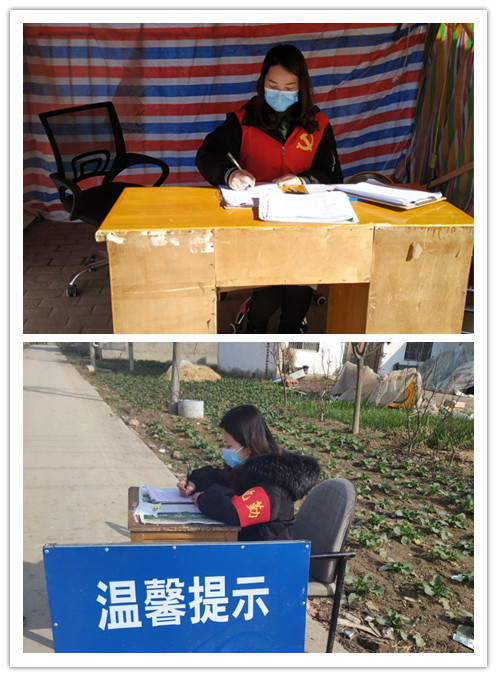 学生四支部党员张梦玉在蚌埠市怀远县兰桥乡联合村张郢组协助村干部劝阻本村村民外出、拦截外来车辆和人员、并进行村内巡查。她说:“我身为一名预备党员、一名学生干部,应当走在疫情防控的前线。在这场战役中,我愿意尽自己所能,不负学校期望,相信国家,相信组织,紧随其后。”