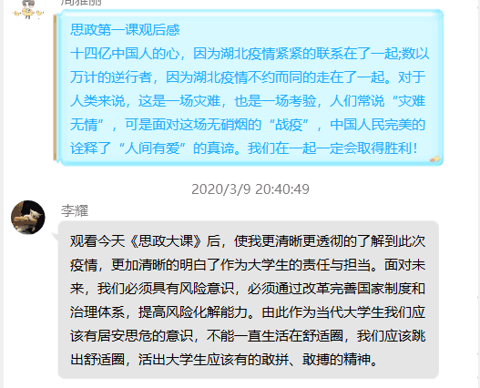 课程结束后,该院学生通过QQ、易班、钉钉等平台进行热烈讨论,一致认为这是一场生动且深刻的思政大课,纷纷表示要积极配合疫情防控工作,更要努力学习,用实际行动践行时代使命。