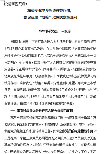 随后,王佩玲作题为《积极发挥党员先锋模范作用,确保我校“战疫”取得决定性胜利》的微党课。线上,全体党员以“疫情防控中你最感动的一件事”为主题,结合文件学习、微党课内容、宣传报道等,分别谈了个人感受和体会。