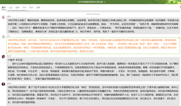 3月15日,习近平总书记给北京大学援鄂医疗队全体“90后”党员回信,向他们和奋斗在疫情防控各条战线上的广大青年致以诚挚的问候。近日,数学与统计学院党团青年积极响应该院党党总支号召,学习回信内容,通过QQ平台热议回信精神。