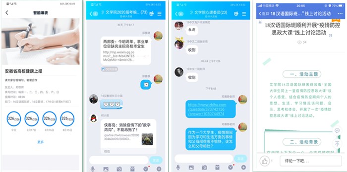 根据上级通知要求,以班级为单位召开班会,每日督促学生按时完成线上健康填报及签到工作,确保不漏报瞒报。针对每日健康报表中出现的异常情况,逐一核实,及时、准确的掌握了学生的身体健康状况和思想动态。鼓励学生党支部、团支部通过互联网创新性的开展线上主题党日、团日活动,引导学生在做好自身防护的前提下积极协助属地村(社区)党团组织开展疫情防控志愿服务活动,为打赢疫情防控阻击战贡献青春力量。