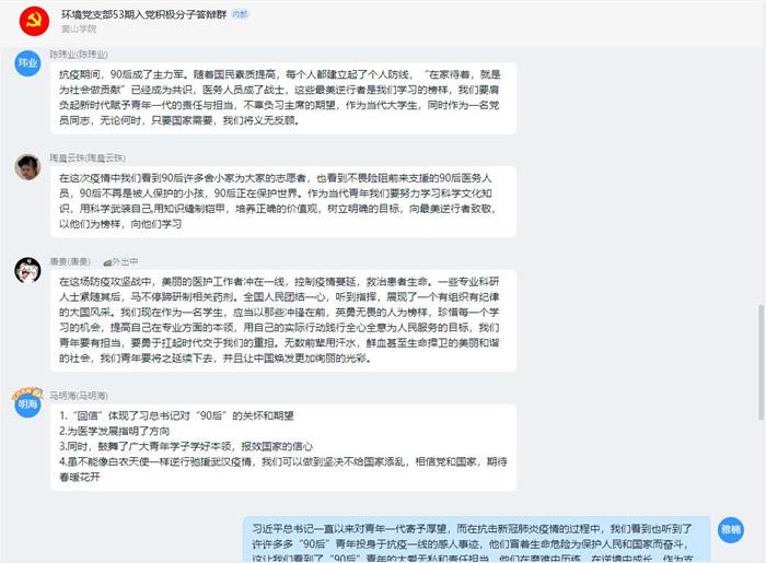 3月23日下午,生环学院环境党支部利用钉钉平台开展确定入党积极分子线上述责答辩活动和支部专题学习会。支部全体党员、入党积极分子代表及答辩对象共43人参会,会议由支部书记王雅楠主持。