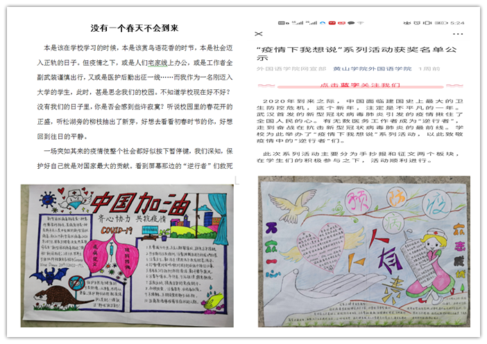 为声援战“疫”,凝聚共克时艰的力量,外国语学院举办“疫情下,我想说……”文艺作品创作活动,用丰富多彩的文艺作品展现新时代大学生心怀家国的情怀。此次活动分为征文组和手抄报组两个组别。