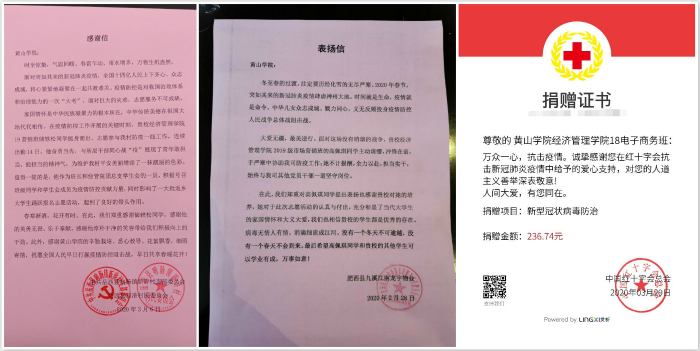 疫情就是命令,防控就是责任。自疫情发生以来,该院青年学子积极投身到当地的疫情志愿工作中去,践行了志愿者的使命和担当。2019级市场营销班储轶松和高佩琪两位同学心系家乡,发挥角色优势,细致暖心服务,贡献青年力量,践行了当代大学生的青春使命。他们受到当地党组织和政府充分肯定,向学院通报他们参与积极参与当地疫情防控事迹。另外,2018级电子商务班积极发起线上为中国红十字总会捐款。