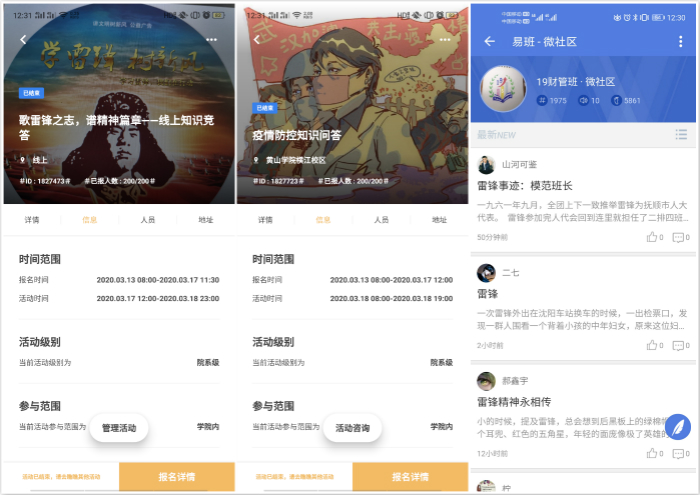 3月7日-30日,该院益+志愿队积极开展“歌雷锋之志,谱精神篇章”线上知识竞答活动、疫情防控知识问答线上活动和“疫情防控微作品征集”活动,将学习雷锋精神与当下抗击疫情的形势相结合,引导广大青年学雷锋精神,抗“疫”先锋,培养社会责任感。同时各班级团支部通过易班、钉钉平台积极开展线上学习雷锋精神主题团日活动。