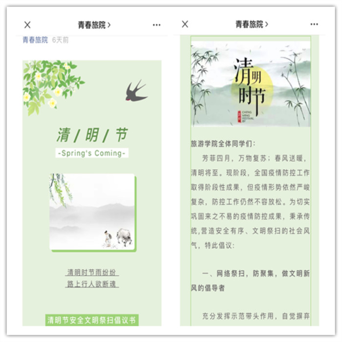 清明前夕,该院微信公众号向全院学生发布《清明节安全文明祭扫倡议书》,号召全体党团青年充分发挥示范带头作用,按照校防控办通知要求,提倡采取网络祭扫、代理祭扫、小规模家庭追思等方式。如有前往实地祭扫同学,务必自觉服从管理,祭祀时自觉佩戴口罩,听从引导有序行进,缩短驻留时间。号召同学们做文明祭扫的践行者,用文明祭祀的实际行动,践行“绿水青山就是金山银山”理念。