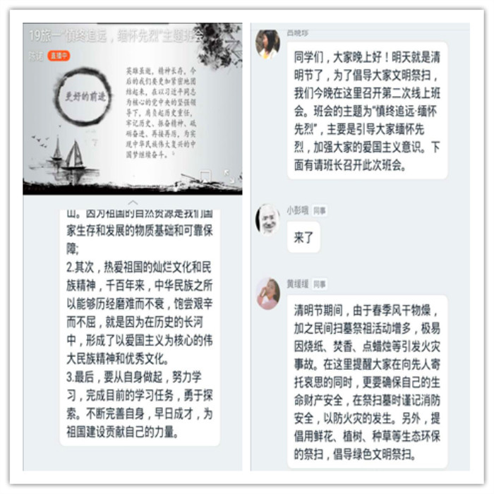 2020年是特殊的一年,全国人民众志成城抗击新冠疫情,期间涌现出了一批不畏艰险,迎难而上的逆行者们,他们用无畏的勇气,坚定的信念,惊人的毅力感动着我们,有人为此献出了宝贵的生命。清明节当天的云端主题班会中,各班级辅导员或班级学生干部在线讲述着疫情防控中的英雄事迹,希望同学们学习他们身上坚韧不拔、顽强拼搏、无私奉献的精神,争做“六有”青年。