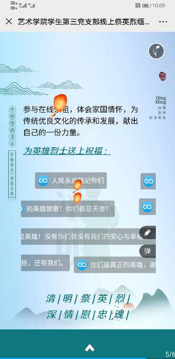 在新冠肺炎疫情即将取得全面胜利的时刻,缅怀先烈,祭扫英烈,弘扬英烈精神传承红色基因,艺术学院党委制作云祭祀小程序,参与在线祭奠,向英烈们表达敬意、寄托哀思,体会家国情怀,为传统优良文化的传承和发展,献出自己的一份力量。