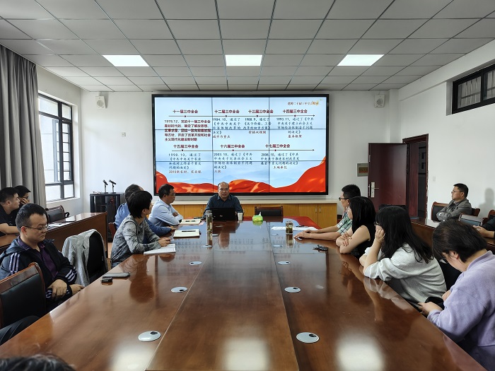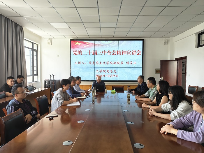 10月9日下午,文学院党总支在文端楼二楼会议室召开党的二十届三中全会精神宣讲会,会议邀请马克思主义学院副院长刘芳正作题为《学习贯彻党的二十届三中全会精神》专题报告,文学院党总支书记汪方学主持会议。文学院全体教师参加会议。