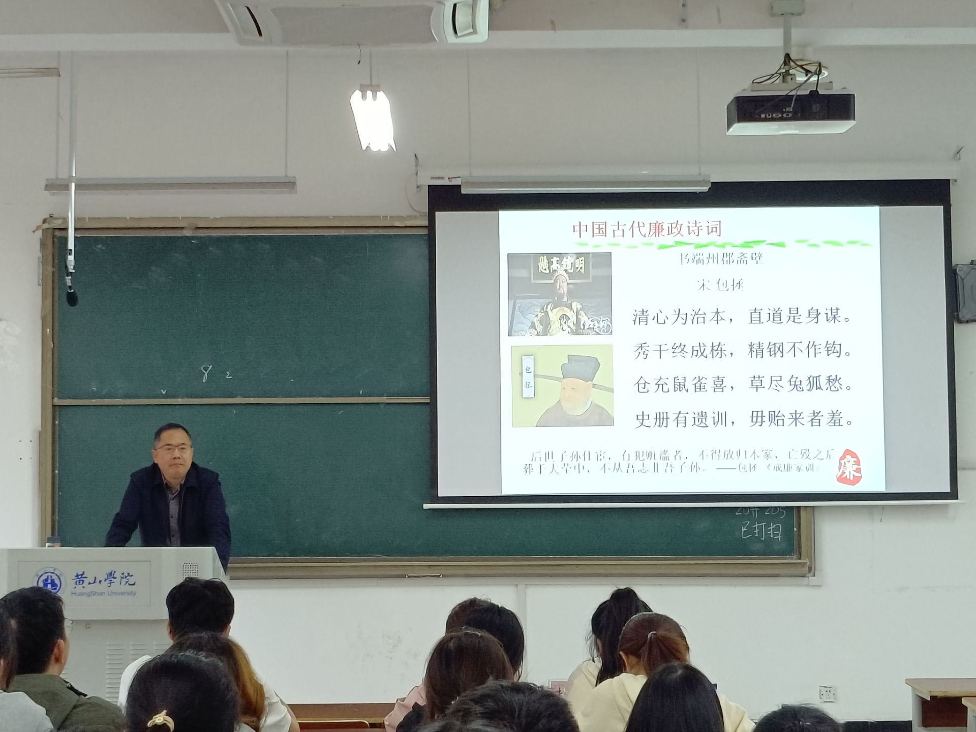 朱宏胜以“传承廉洁文化 加强廉政建设”为题,以中国古代廉政诗词和廉政故事为载体,展开了一堂别开生面的廉政专题讲座。从战国屈原《招魂》、宋朝包拯《手端州郡斋壁》、明代况中《拒礼诗》、《离任》等廉洁诗词入手,带领全体学生干部从古诗词中的清廉文化和美好高洁、以史为鉴加强廉政建设等方面生动有趣地解读了古代的廉洁思想,同时向同学讲述了《子罕辞玉》《杨震拒金》《一钱太守》《陶母退鱼》等经典廉政故事,并诠释了中华廉政文化的精神内涵与特征。此次专题讲座不仅阐述了古代廉洁文化的精神内涵,而且教育引导全院学生干部树清风、扬正气,努力营造崇廉尚洁、风清气正的校园氛围。