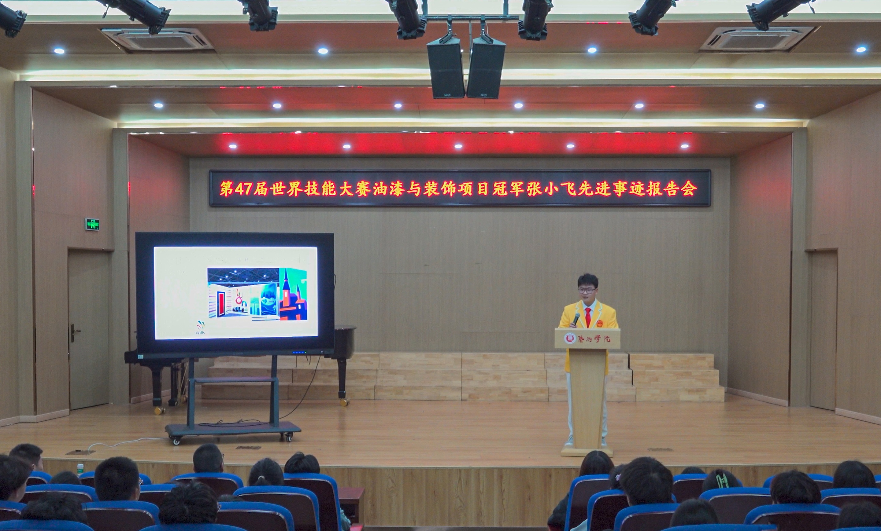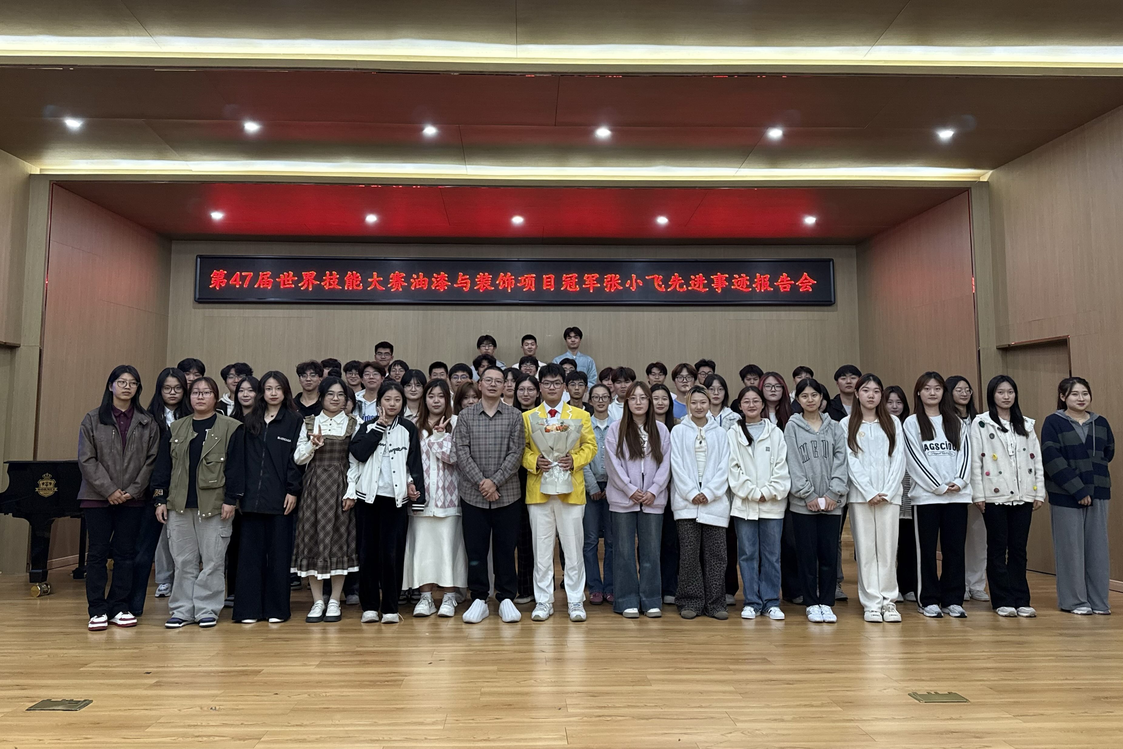 11月4日晚,艺术学院在音乐厅举行了第47届世界技能大赛油漆与装饰项目金牌选手张小飞先进事迹报告会,120余名学生代表参加了报告会。