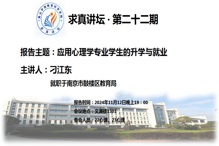 11月12日晚,教育科学学院求真讲坛第二十二期在文渊楼303教室举行。邀请了南京市鼓楼区教育局刁江东同志作题为《心理学本科的职业规划之路》的报告,刁江东是该院应用心理学专业2018届毕业生,毕业后先在黄山市某公司担任管理职务,2021年考入华南师范大学攻读硕士学位。读研期间他以第一作者发表一篇SCI,以共同作者身份发表三篇SCI/SSCI。2024年他参加了国考、广东省选调、江苏省省考,深圳市市考4场公务员考试。国考笔试排行第五,面试第一,综合排名第一进入体检;深圳市市考笔试第一;江苏省省考笔试第三,面试第一,最终入职南京市鼓楼区教育局。