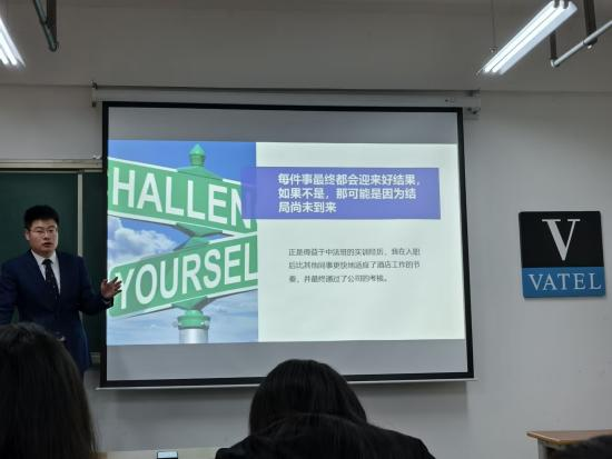 陈磊围绕大学成长历程及从业经验和感悟两个方面进行分享。在校的学习和实践经历,造就了他吃苦耐劳的精神,培养了他良好人际交往能力,为他步入职场并脱颖而出打下了雄厚的基础;研究生阶段于法国留学的经历又让他拥有了国际化的视野和对酒店行业深层次的理解。他用自己的真实经历为学弟学妹们树立了良好的标杆,引导了发展方向,最后以“若是掌声还没来,自己也可多喝彩”给24级酒店管理(中法)专业的同学们以鼓励。