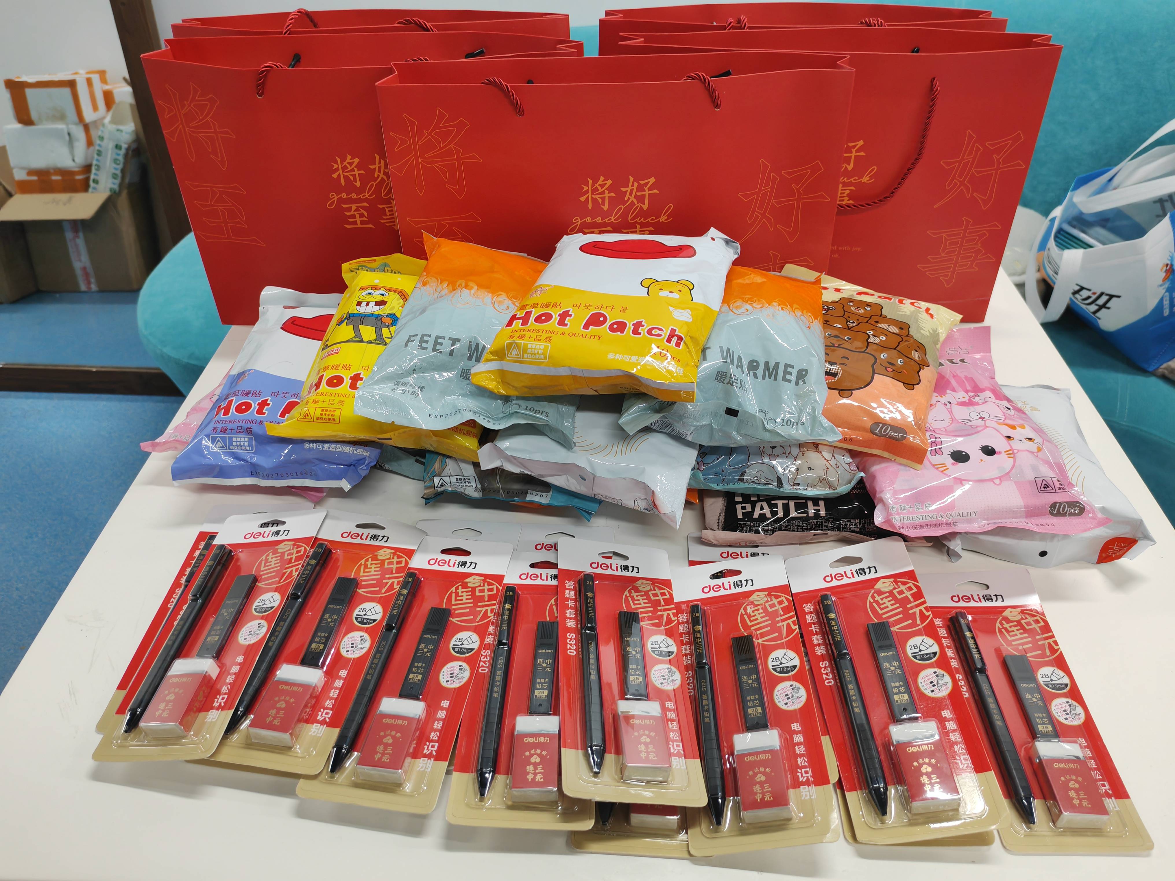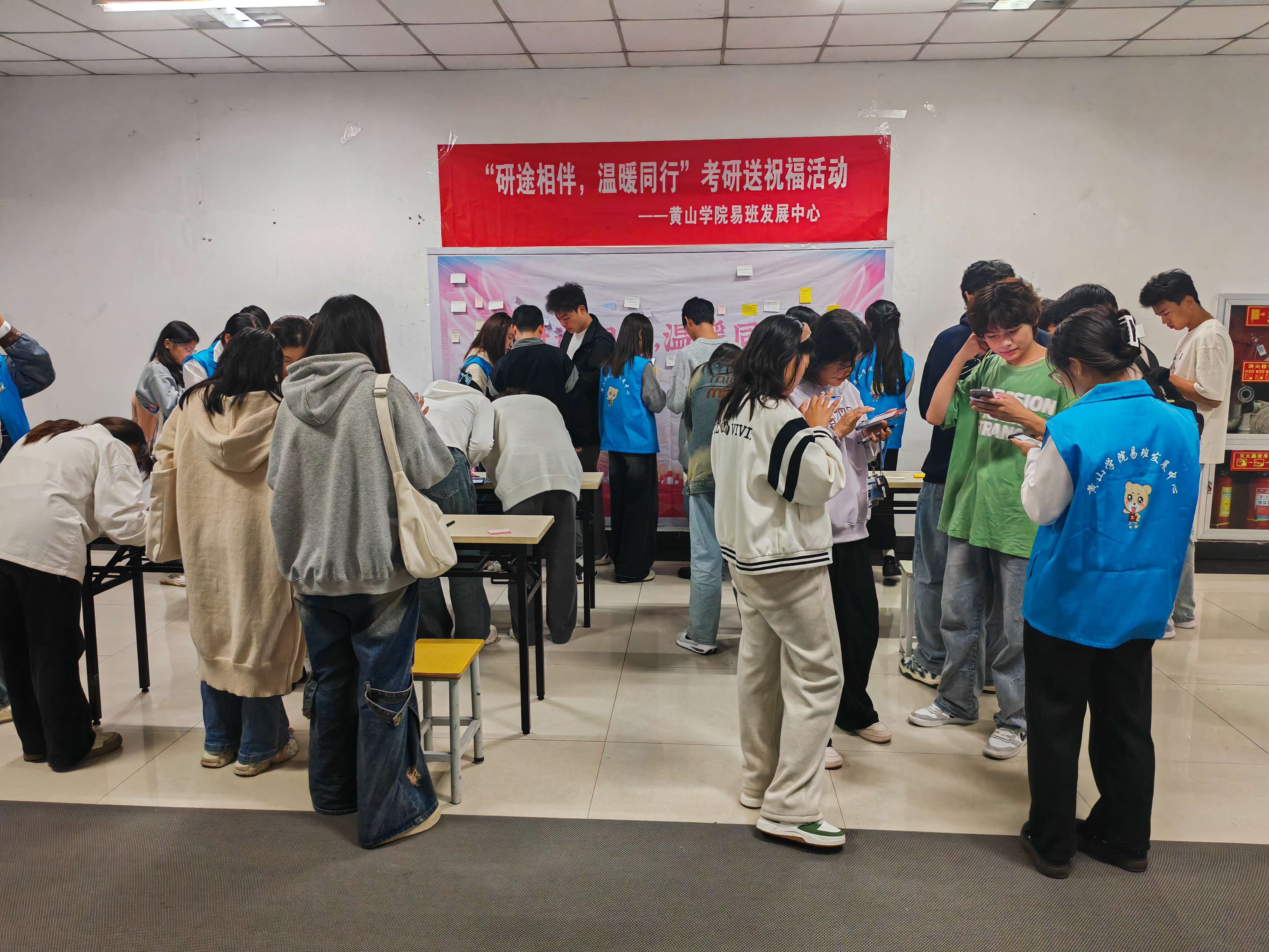 此次活动采取了线上线下相结合的方式进行。线下部分在图书馆“一站式”学生社区一楼大厅举行,工作人员们精心筹备,热情地组织并引导参与学生在便签纸上写下对考研学子的诚挚祝福,并将这些满载着祝福的便签粘贴于祝福墙上。墙上的祝福语温馨而鼓舞人心,为在场的每一位学子带来了温暖与活力。此外,中心工作人员还向考研学子们赠送了暖贴、纸巾、铅笔套装等实用物品,这份意外的惊喜与关怀让学子们深受感动。他们表示,在备考的最后冲刺阶段,将承载着学校和同学们的关爱与祝福,全力以赴,力争取得优异的成绩。