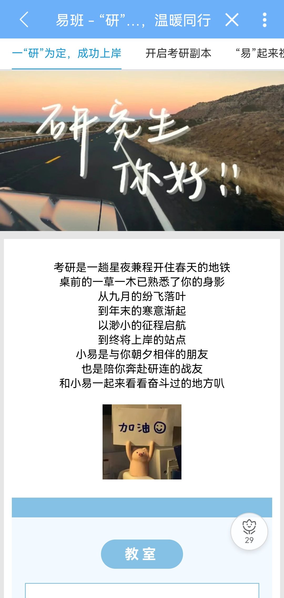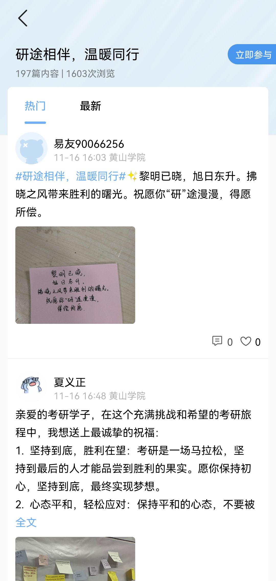 线上活动则通过搭建轻应用和发布易瞄瞄话题的形式进行。同学们通过浏览“研途相伴”轻应用,深刻感受到了考研学子们在漫长征途中的不懈努力和坚持。大家纷纷在评论区留下自己的祝福,同时通过易瞄瞄话题“研途相伴,温暖同行”上传手写祝福语,表达对考研学子们的衷心祝愿。该话题的浏览量接近两千人次,充分展现了校园内对考研学子的广泛关注与支持。
