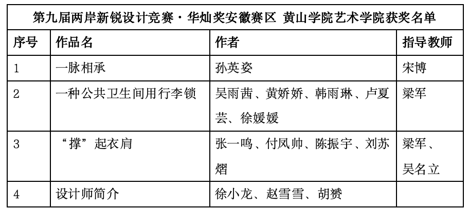 近日,第九届两岸新锐设计竞赛·华灿奖赛区赛(安徽赛区)圆满落下帷幕,经过评审专家的严格评选,我校艺术学院四组学生作品荣获三等奖4项,为学校争得了荣誉。