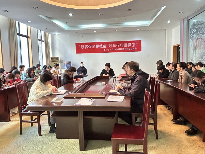 为进一步加强图书馆队伍建设,提升图书馆业务水平,培养造就一支职业道德优良、业务技能精湛、工作熟练又充满活力的高素质图书馆员队伍,11月28日,图书馆工会在二楼会议室举办了馆员业务技能竞赛。图书馆全体馆员参加了此次竞赛活动。